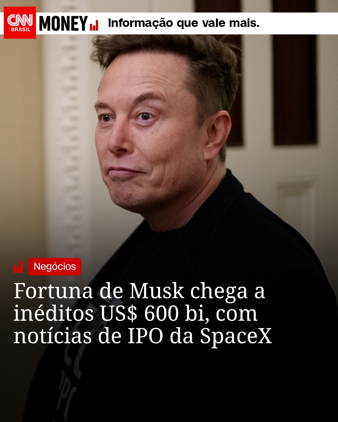 VALORIZAÇÃO DAS AÇÕES DA TESLA TAMBÉM IMPULSIONARAM FORTUNA. Nessa segunda-feira (15), Elon Musk tornou-se a primeira pessoa da história a atingir um patrimônio líquido de US$ 600 bilhões, segundo a Forbes, após notícias de que sua startup SpaceX provavelmente abriria seu capital com um valuation de US$ 800 bilhões. Musk, que foi o primeiro a ultrapassar a marca de US$ 500 bilhões em patrimônio líquido em outubro, possui uma participação estimada em 42% na SpaceX, que está se preparando para abrir seu capital no próximo ano, informou a Reuters na semana passada.