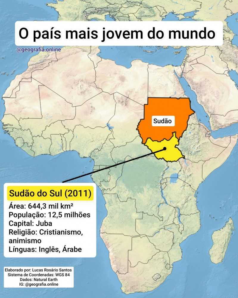 O Sudão do Sul é considerado o país mais jovem do mundo, pois conquistou sua independência em 9 de julho de 2011, após se separar do Sudão. Essa divisão aconteceu depois de muitos anos de conflitos marcados por diferenças religiosas, étnicas e econômicas entre o norte, majoritariamente muçulmano, e o sul, com populações cristãs e de religiões tradicionais africanas. Após um acordo de paz, a população do sul participou de um referendo e votou quase unanimemente pela independência, levando ao reconhecimento do novo país pela Organização das Nações Unidas. Apesar de ser o mais novo Estado do mundo, o Sudão do Sul ainda enfrenta grandes desafios, como conflitos internos, pobreza e dificuldades de desenvolvimento.