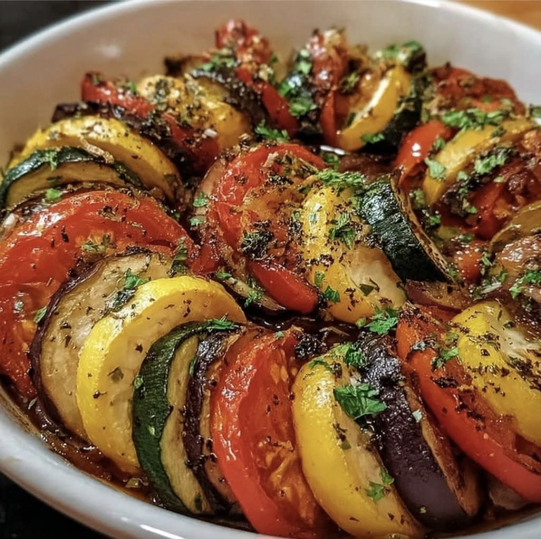 Em uma vasilha tempere todos os legumes cortados com azeite, sal e pimenta do reino. Em uma assadeira adicione o molho e disponha as rodelas de legumes intercaladas. Leve ao forno 190c por 25 minutos. Dica: quanto mais fino você cortar os legumes, mais rápido será o cozimento. Coloque papel alumínio até a metade do cozimento e depois retire para dourar. Finalize com salsinha picada. Sirva quente ou frio. Perfeito acompanhamento para carnes, peixes, frango. Fica maravilhoso para servir com torradas ou pães.