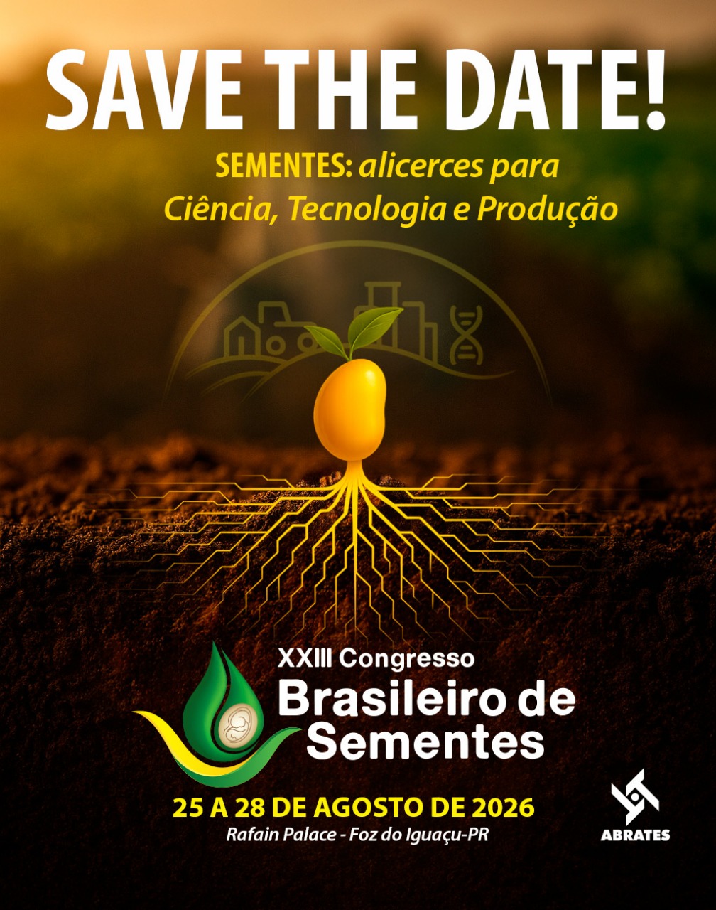 A Associação Brasileira de Tecnologia de Sementes (Abrates) acaba de anunciar a realização do XXIII Congresso Brasileiro de Sementes (CBSementes), que acontecerá de 25 a 28 de agosto de 2026, no Rafain Palace Hotel & Convention, em Foz do Iguaçu (PR), pela segunda vez consecutiva. A escolha de Foz do Iguaçu e do Rafain, que conta com ampla infraestrutura e localização estratégica aos principais pontos turísticos da cidade, reforça o compromisso da Abrates em oferecer conforto e praticidade aos participantes. A edição de 2026 tem como tema central “Sementes: alicerces para ciência, tecnologia e produção”, refletindo o papel das sementes como base para a inovação, o avanço tecnológico e a produção sustentável no agronegócio brasileiro.