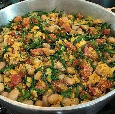 Em uma panela grande, frite o bacon em fogo médio até dourar e soltar a gordura. Acrescente a linguiça calabresa e frite até ficar bem douradinha. Junte a cebola e o alho e refogue até que fiquem macios e levemente dourados. Adicione os ovos inteiros, mexendo bem para que cozinhem e se misturem aos outros ingredientes. Acrescente o feijão cozido e escorrido e mexa delicadamente para incorporar os sabores. Aos poucos, vá adicionando a farinha de mandioca, misturando até atingir a textura desejada. Tempere com sal e pimenta-do-reino a gosto. Por fim, adicione a couve fatiada, misture com cuidado e finalize com cheiro-verde picado. Sirva quente com arroz branco, carne de sol, bife acebolado ou torresmo.