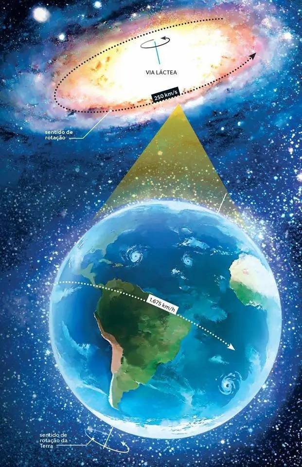Por que não sentimos a Terra girar? A Terra gira em torno do seu eixo e tudo o que está em sua superfície gira junto com ela. Além disso, a atmosfera ao seu redor tem o mesmo movimento e também gira com ela. Então, por que não podemos sentir alguma coisa? Por causa da Lei da Inércia! O planeta Terra gira a uma velocidade constante de 1.675 km/h. Todos nós estamos girando com ele na mesma velocidade angular e na mesma direção. Assim como num avião em pleno voo, não somos empurrados para o fundo porque viajamos na mesma velocidade do veículo. Porém, na hora da decolagem e do pouso, sentimos uma força que nos empurra para trás e para a frente. Isso por que estamos em repouso em relação à aeronave, que muda de velocidade. Seria o mesmo se a Terra parasse: sairíamos todos voando, pois continuaríamos em movimento.