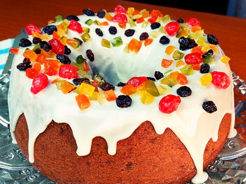 Misture o açúcar de confeiteiro com o leite até formar uma calda grossa e branca. Espalhe sobre o bolo frio e decore com cerejas, uvas passas e pedacinhos de frutas cristalizadas.