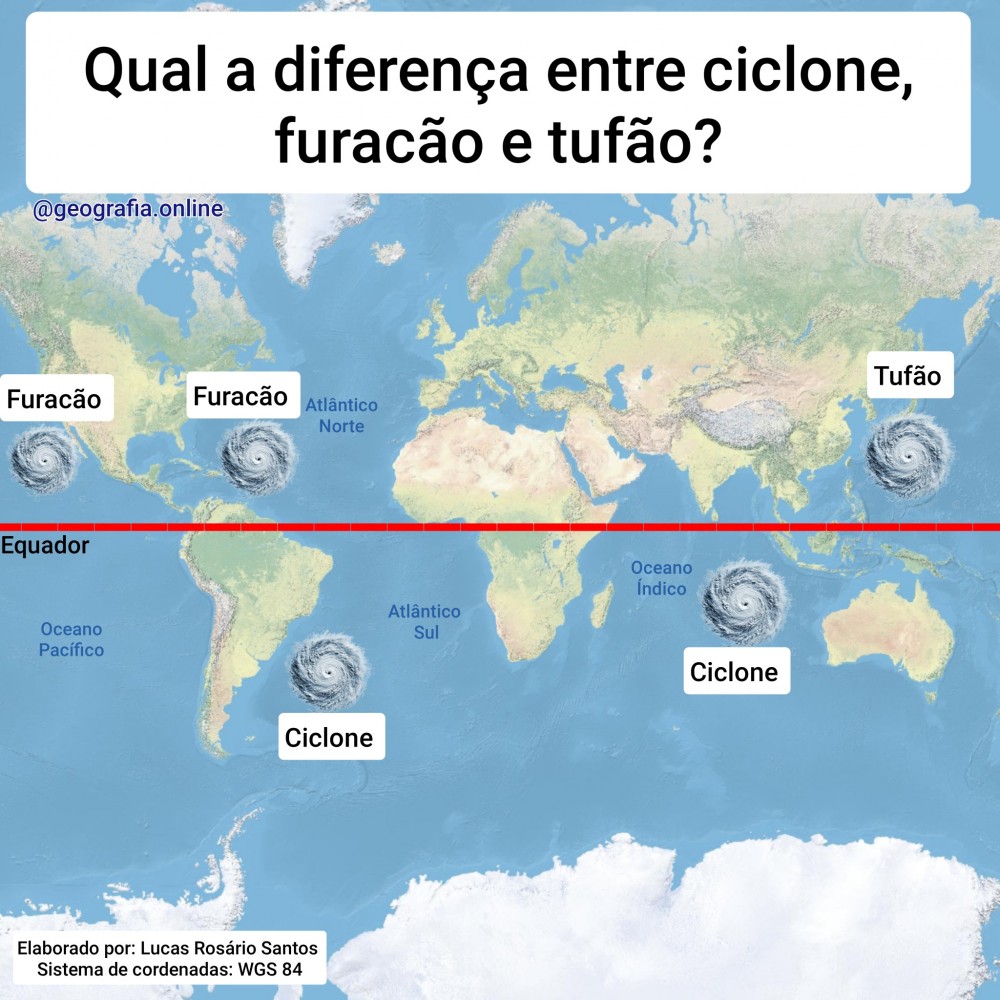 > Furacão: É o nome dado quando ocorre no Oceano Atlântico Norte (afetando o Caribe, EUA, México) e no Pacífico Nordeste. É o termo mais familiar para nós no Ocidente.