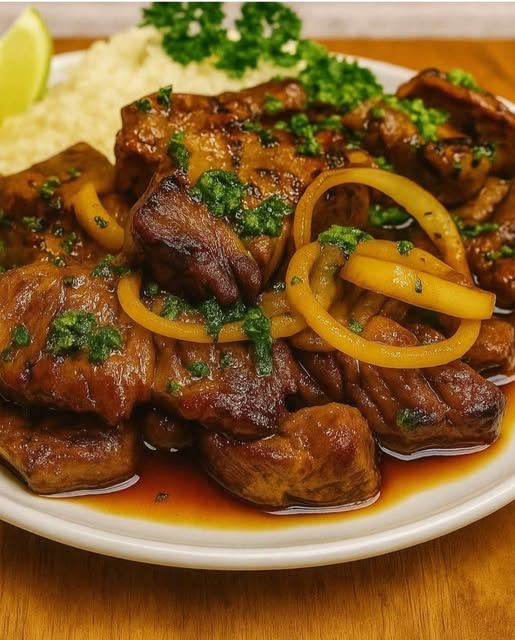 CARNE DE PANELA COM CEBOLA E MOLHO VERDE