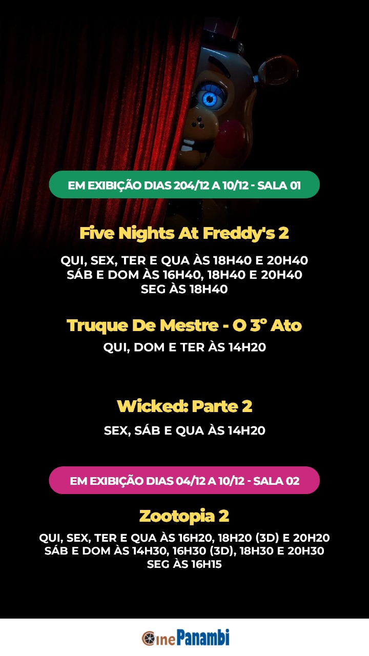 O Cine Panambi acompanha amanhã (4) mais uma estreia nacional super aguardada, Five Nights at Freddy's 2, da Universal Pictures, filme de terror sobrenatural baseado na franquia de jogos eletrônicos Five Night sat Freddy’s. A história se passa um ano após os eventos do primeiro filme. O ex-segurança Mike Schmidt (Josh Hutcherson) e a policial Vanessa Shelly (Elizabeth Lail) tentam esconder a verdade sobre o destino dos animatrônicos da irmã de Mike, Abby (Piper Rubio). No entanto, Abby foge para se reconectar com Freddy, Bonnie, Chica e Foxy, o que desencadeia uma nova série de eventos aterrorizantes e revela segredos sombrios sobre a origem da pizzaria. Agora anote aí os horários das sessões (SALA 1): quinta, sexta, terça e quarta às 18h40 e 20h40; sábado e domingo às 16h40, 18h40 e 20h40; e, segunda às 18h40.