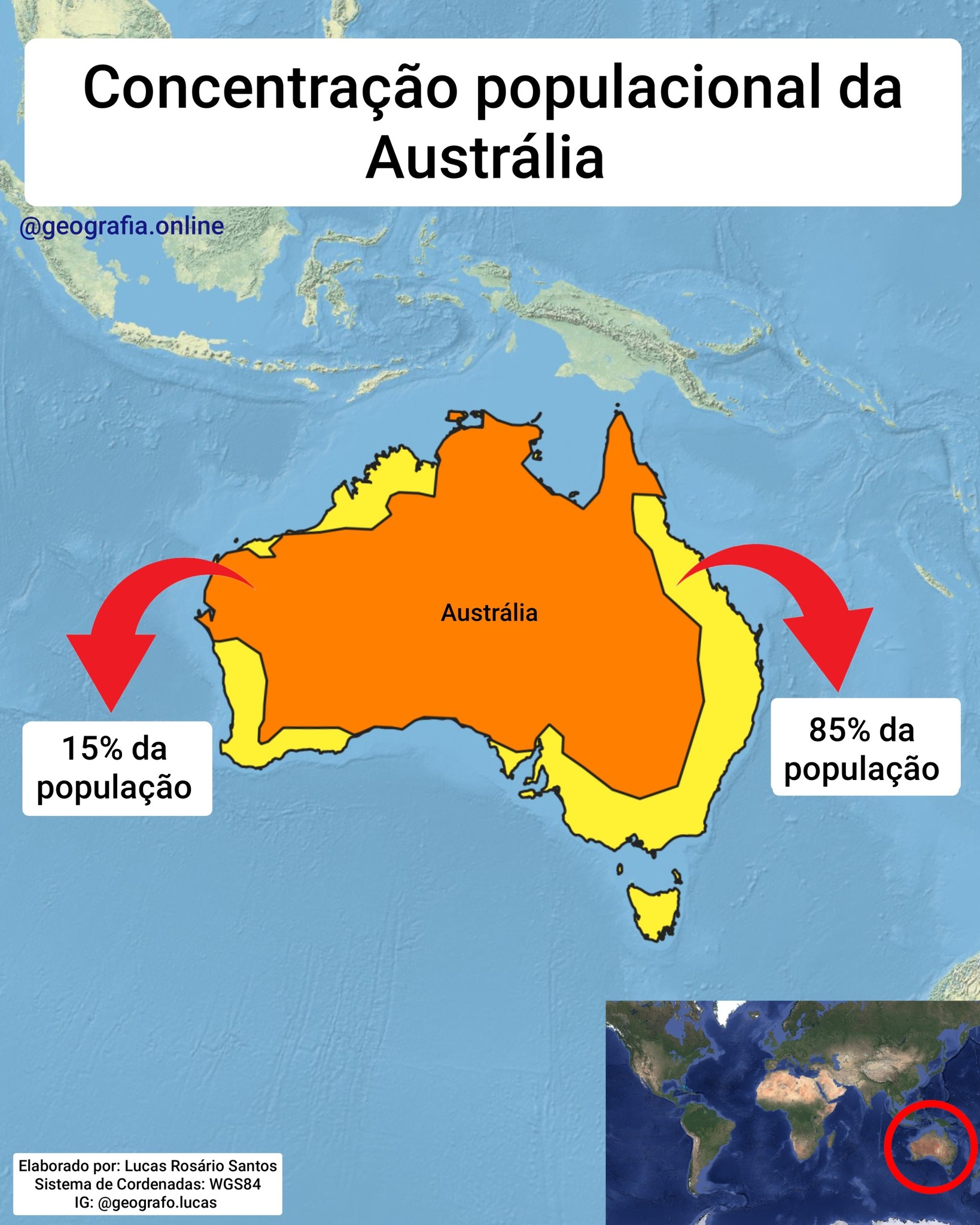 A Austrália apresenta uma distribuição populacional extremamente concentrada nas zonas litorâneas, com cerca de 85% da população vivendo ao longo das costas temperadas do leste e sudeste, onde se encontram as maiores metrópoles como Sydney e Melbourne, enquanto o interior árido (outback) abriga uma proporção muito menor da população em função de condições ambientais severas e limitada disponibilidade de recursos naturais. Em 2025, a população total da Austrália está estimada em aproximadamente 27,5 milhões de habitantes.
