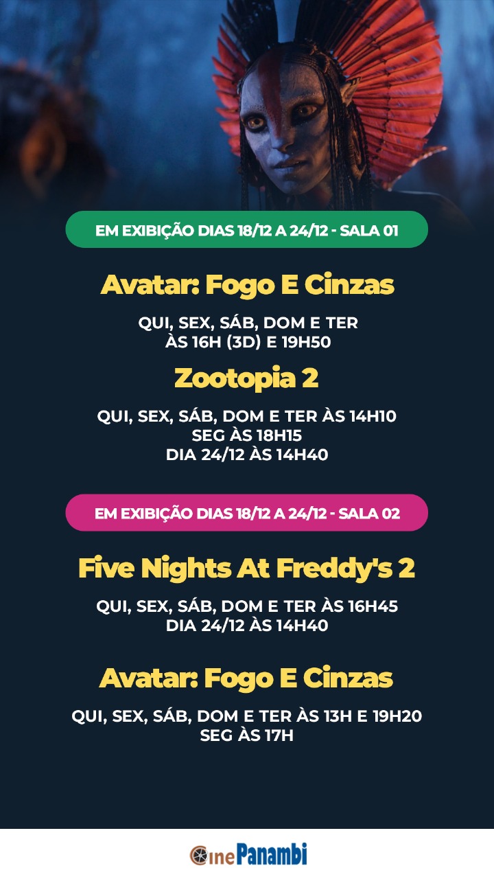 Além de Avatar, a nova programação do Cine Panambi (18 a 24/12) mantém em exibição os filmes Zootopia 2 e Five Nights At Freddy’s 2.