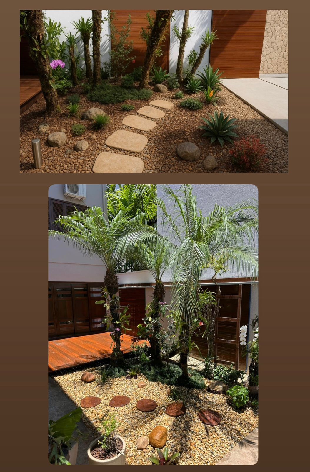 Já a segunda imagem é o resultado real, entregue com carinho, técnica e muita atenção aos detalhes. A harmonia entre pedras, vegetação, sombras naturais e texturas foi preservada, provando que a tecnologia pode inspirar, mas é o trabalho humano que transforma sonhos em paisagens verdadeiras.