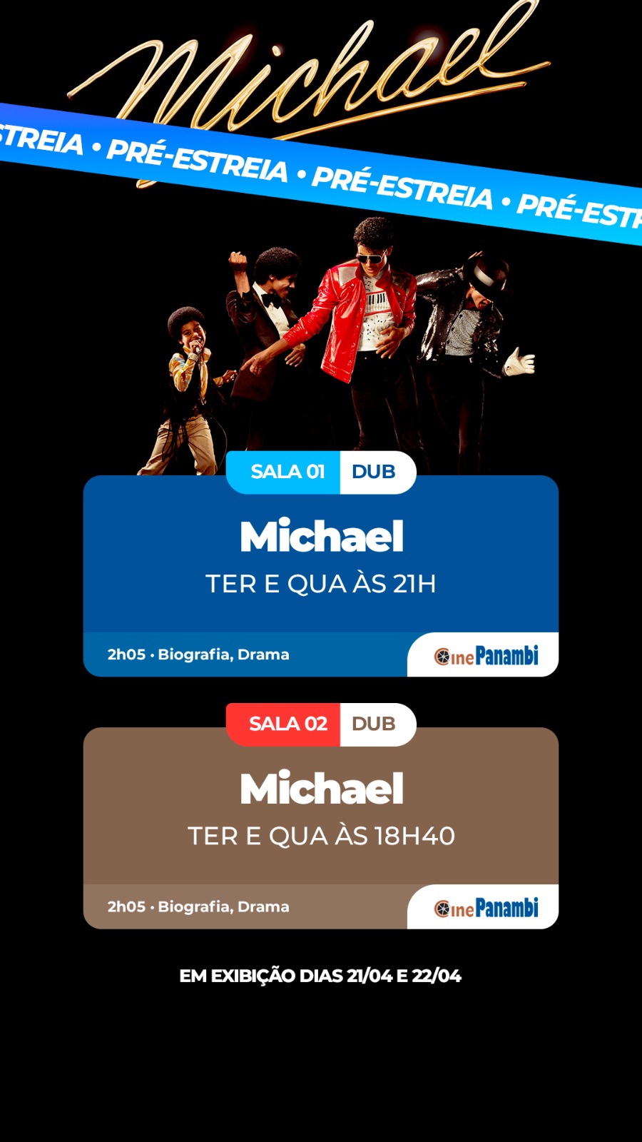 Agora a cereja do bolo (filme super aguardado): Michael, biografia do astro Michael Jackson, estreia quinta-feira que vem, 23/4, mas para os fãs mais ansiosos tem as sessões de pré-estreia terça (21) e quarta (22) às 18h40 e 21h, com vendas já liberadas...
