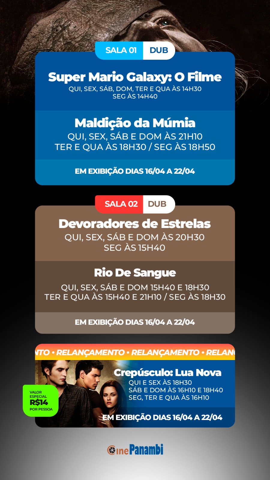 Ontem o Cine Panambi estreou a sua nova programação com duas estreias: o suspense/terror Maldição da Múmia e o drama Rio de Sangue. Os dois dividem a telona com Super Mario Galaxy: O Filme, Devoradores de Estrelas (filme excelente e com boa bilheteria) e Crepúsculo: Lua Nova (relançamento)...