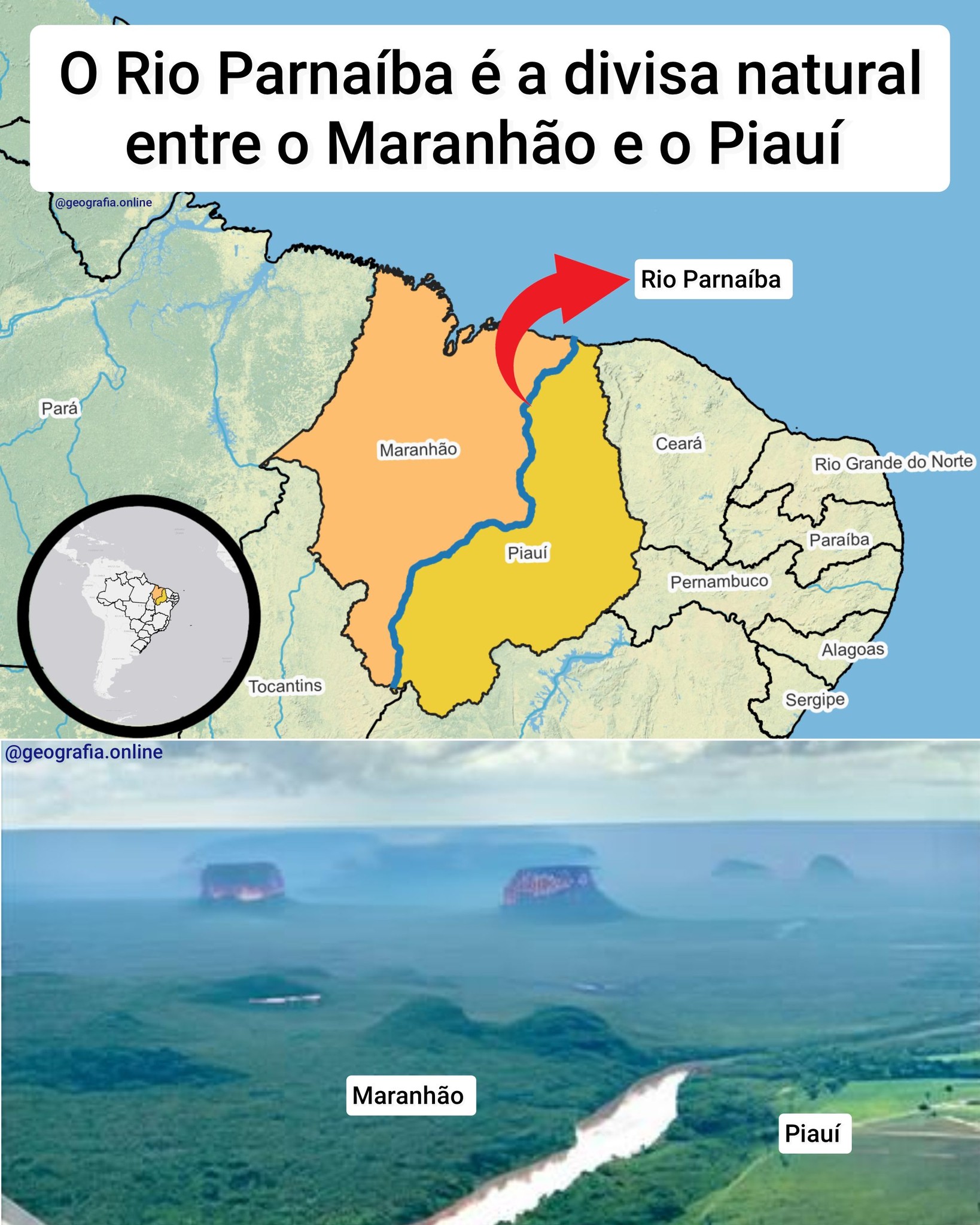 O Rio Parnaíba é a divisa natural entre os estados do Maranhão e Piauí. Além de sua função como limite territorial, esse rio tem grande relevância para a região Nordeste, pois contribui para o abastecimento de água, a agricultura e a organização das atividades humanas ao seu redor. Com mais de 1.400 km de extensão, ele nasce no sul do Piauí e segue em direção ao Oceano Atlântico, onde forma um delta, destacando-se como um dos principais rios do Nordeste brasileiro.