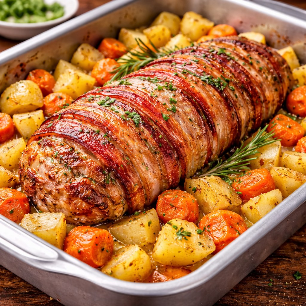 1. Para essa receita, comece fazendo alguns furos no lombo e coloque em um recipiente. 2. No processador ou liquidificador, adicione a cebola, o alho, as ervas finas, a pimenta-do-reino, o sal, o azeite, o alecrim, a água e bata tudo muito bem. 3. Despeje sobre o lombo, cubra com plástico filme e deixe marinar de um dia para o outro. 4. Depois, coloque em uma forma e envolva o lombo com as tiras de bacon. 5. Coloque a batata e a cenoura picadas em volta dele e despeje o tempero. 6. Leve ao forno preaquecido a 200 graus por 2 horas.