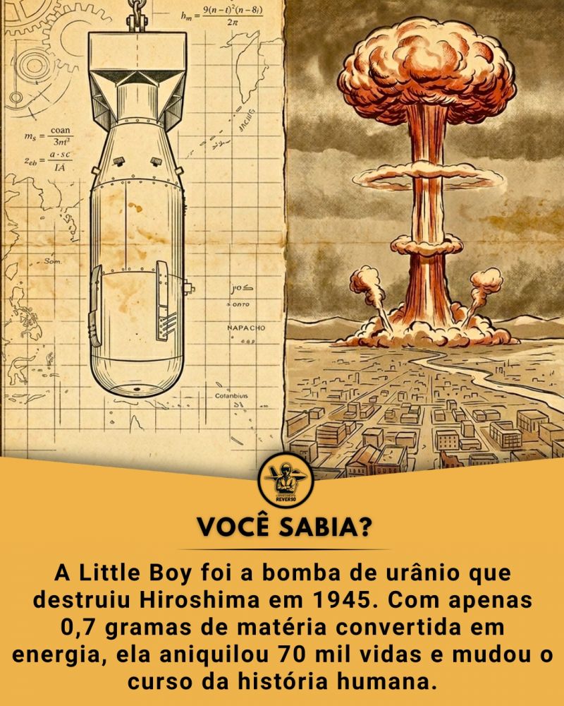 A Little Boy foi a primeira arma nuclear utilizada em guerra, lançada sobre a cidade japonesa de Hiroshima em 6 de agosto de 1945. Diferente de outros projetos, ela operava por um mecanismo de "gatilho" simples, onde um projétil de urânio-235 era disparado contra um alvo de urânio para atingir a massa crítica. Embora carregasse cerca de 64 quilos de urânio altamente enriquecido, a eficiência da arma foi surpreendentemente baixa: estima-se que apenas 0,7 gramas da matéria-prima tenham sido convertidos em energia pura no momento da explosão. Esse fragmento minúsculo, menor que uma moeda, liberou uma potência equivalente a 15 mil toneladas de TNT. A detonação ocorreu a 580 metros de altitude para maximizar o impacto da onda de choque e do calor térmico sobre a população civil e as estruturas da cidade. No momento da explosão, a temperatura no centro da bola de fogo atingiu milhões de graus Celsius, gerando um flash de luz que cegou instantaneamente quem olhasse na direção do hipocentro. Cerca de 70 mil pessoas morreram no ato, e o calor foi tão intenso que as sombras das vítimas e de objetos foram permanentemente projetadas em paredes e calçadas, um fenômeno causado pela desintegração instantânea da matéria orgânica diante da radiação térmica extrema.