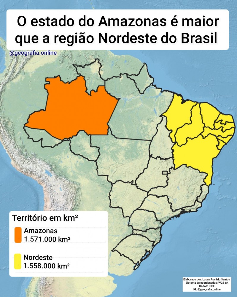 O estado do Amazonas, sozinho, é maior do que todos os 9 estados do Nordeste juntos. Enquanto o Amazonas ocupa cerca de 1.571.000 km², a região Nordeste soma 1.558.000 km² ou seja, uma diferença de apenas 13.000 km², Esse dado surpreende porque tendemos a imaginar uma região como algo necessariamente maior do que um único estado, mas a escala continental do Brasil quebra essa lógica. O Amazonas representa sozinho quase 18% do território nacional.